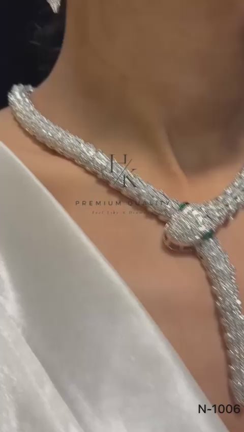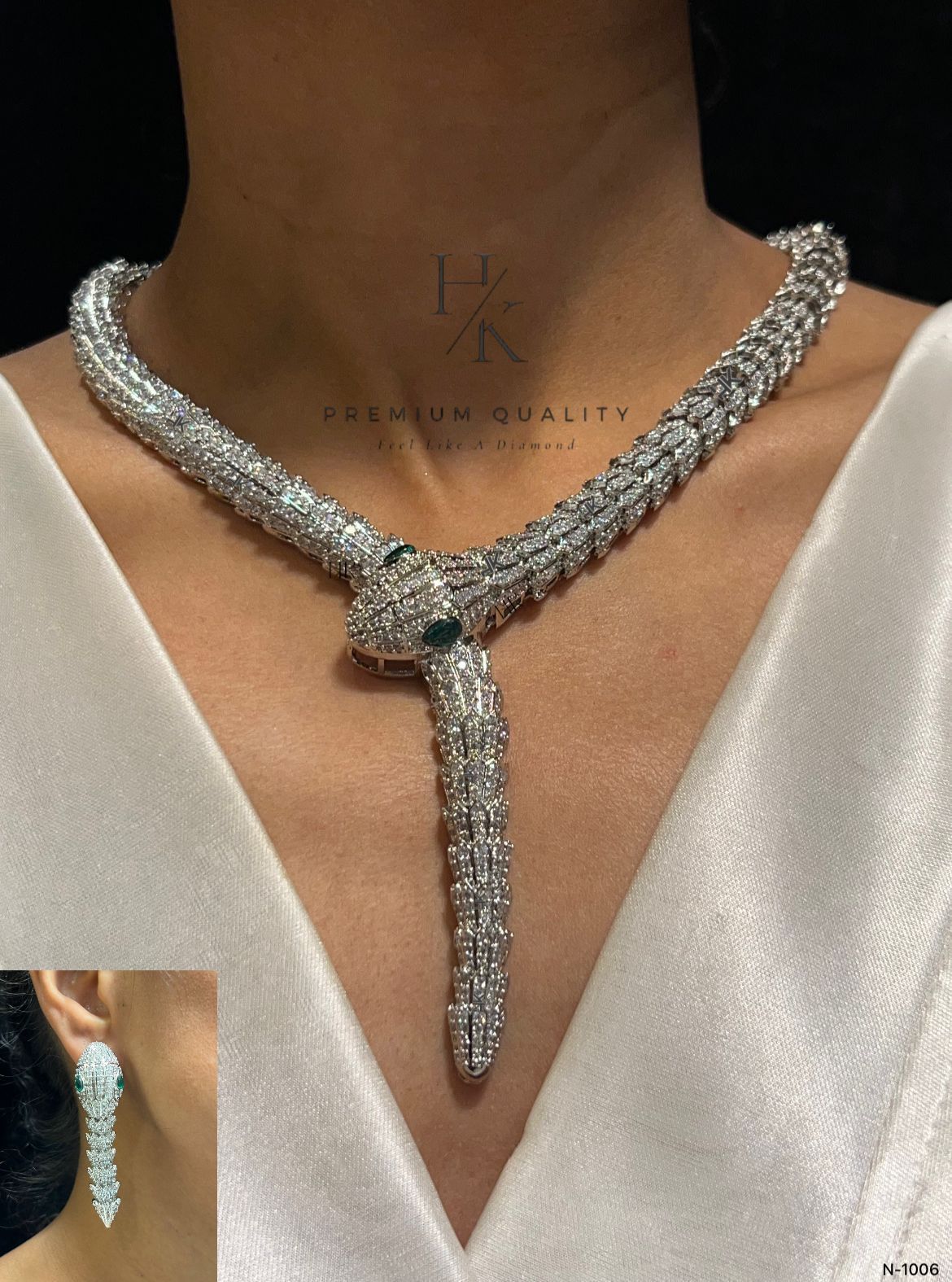 This premium american diamond bvlgari inspired Necklace set comes with beautiful earrings that can be worn separately for a statement look. So many different ways to style this piece as the neutral colors can go with any outfit! A truly unique find, this piece is carefully handcrafted from the best! This set contains natural stones, so can vary from color, size and shape.