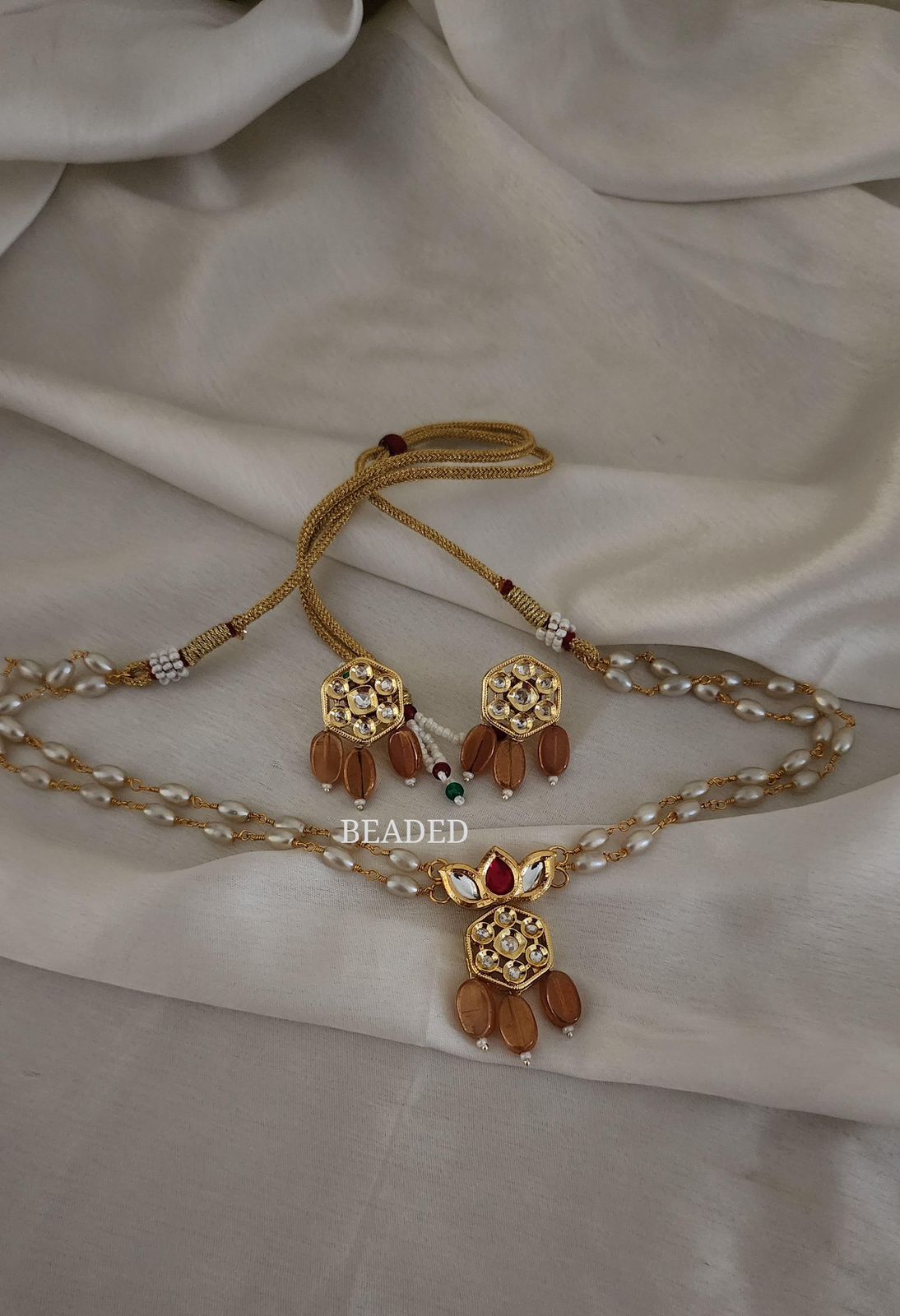 This thapa kundan/dabbi kundan Necklace set comes with beautiful earrings that can be worn separately for a statement look. So many different ways to style this piece as the neutral colors can go with any outfit! A truly unique find from the lands of rajasthan, this piece is carefully handcrafted from the best! This set contains natural stones, so can vary from color, size and shape.