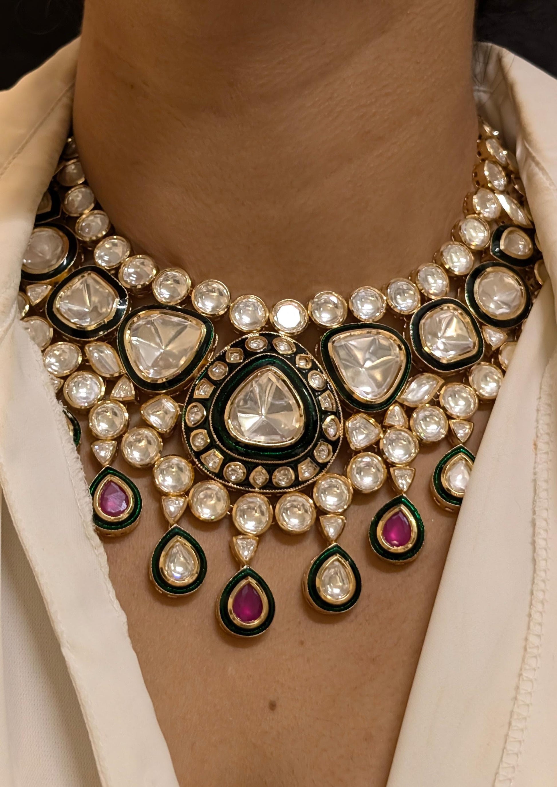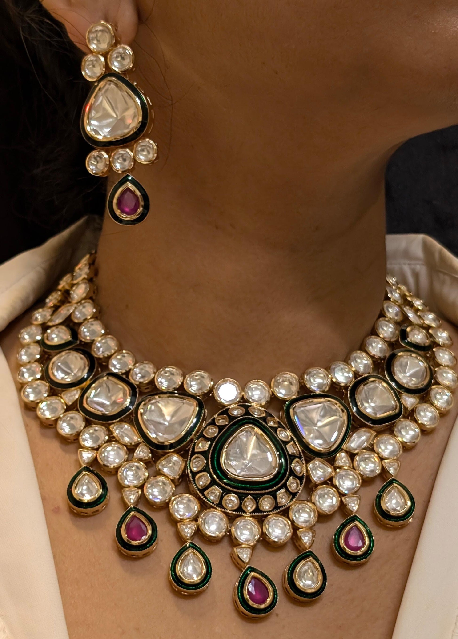 This thapa kundan/dabbi kundan Necklace set comes with beautiful earrings that can be worn separately for a statement look. So many different ways to style this piece as the neutral colors can go with any outfit! A truly unique find from the lands of rajasthan, this piece is carefully handcrafted from the best! This set contains natural stones, so can vary from color, size and shape.